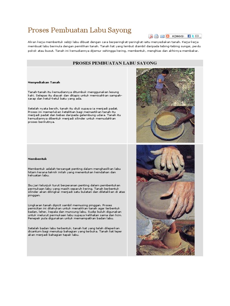 Tinggalkan Jawapan Batal balasan. Terdapat beberapa proses yang terlibat dalam menghasilkan labu sayong dengan menggunakan teknik acuan ini. Aliran kerja membentuk sebiji labu dibuat dengan cara berperingkat-peringkat iaitu menyediakan tanah.