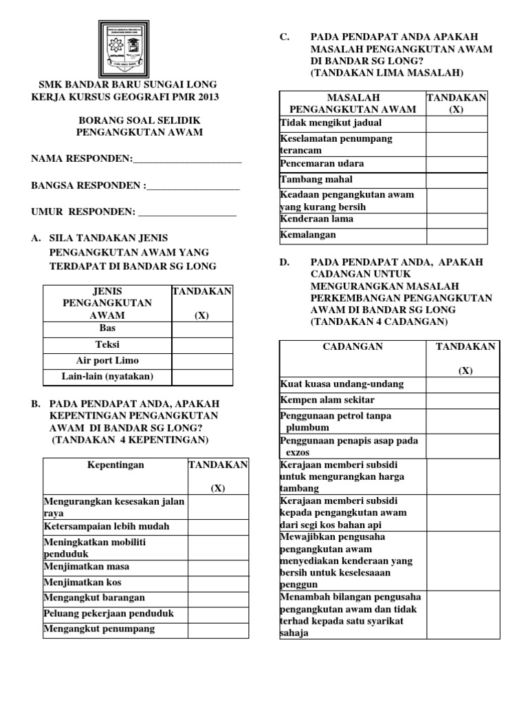 0 0 found this document useful Mark this document as useful. Borang Soal Selidik Geografi Pt3 2017 Nah Contoh Terbaik Borang Soal Selidik Sistem Pengangkutan Awam. Berikut adalah borang soal selidik sistem pengangkutan pt3 yang dapat dijadikan panduan dan rujukan kepada pelajar semua.