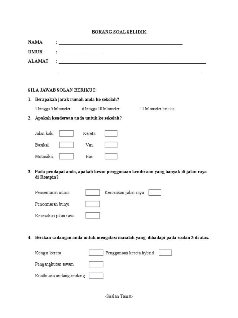 Contoh borang soal selidik pengangkutan Saturday January 8 2022 Edit. Contoh Borang Soal Selidik Pengangkutan Awam Contoh Drop 5. Contoh Borang Soal Selidik Geografi PT3 Tugasan 2022 bagi pelajar tingkatan 3.